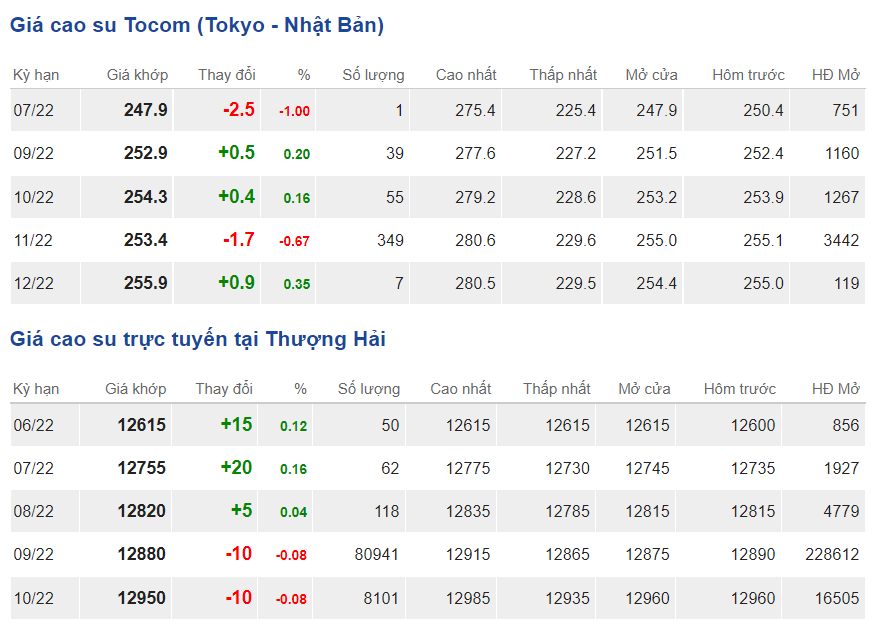 Tại Sở giao dịch hàng hóa Tokyo (TOCOM), giá cao su kỳ hạn giao tháng 7/2022 ghi nhận mức 247,9 yen/kg, giảm 1% (tương đương 2,5 yen/kg) tại thời điểm khảo sát vào lúc 7h10 (giờ Việt Nam).