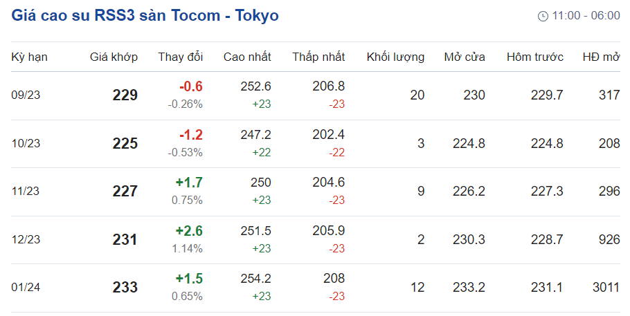Tại Sở giao dịch hàng hóa Tokyo (TOCOM), giá cao su kỳ hạn giao tháng 9/2023 đạt mức 229 yen/kg, giảm 0,26% (tương đương 0,6 yen/kg) tại thời điểm khảo sát vào lúc 6h10 (giờ Việt Nam).