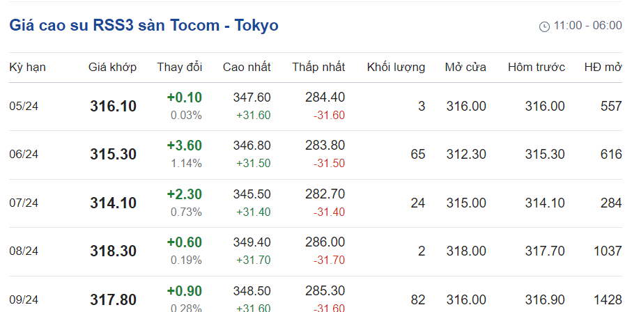 Tại Sở giao dịch hàng hóa Tokyo (TOCOM), giá cao su giao kỳ hạn tháng 5/2024 tăng 0,79% lên mức 316 yen/kg tại thời điểm khảo sát vào lúc 6h00 (giờ Việt Nam).