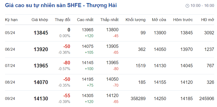 Trên Sàn giao dịch hàng hóa tương lai Thượng Hải (SHFE), giá cao su RSS3 giao kỳ hạn tháng 5/2024 duy trì ổn định ở mức 13.845 nhân dân tệ/tấn.
