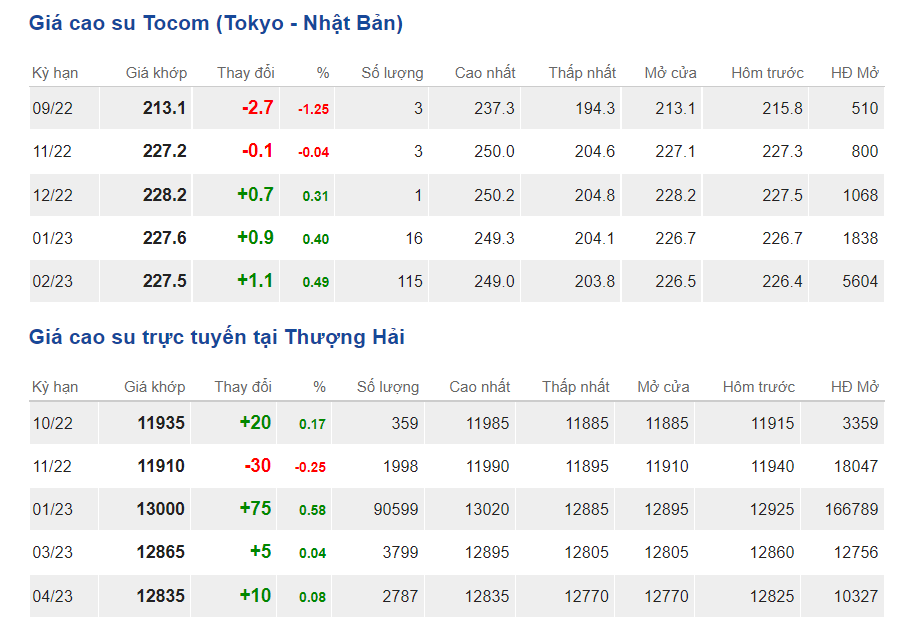Tại Sở giao dịch hàng hóa Tokyo (TOCOM), giá cao su kỳ hạn giao tháng 9/2022 đạt mức 213,1 yen/kg, giảm 1,25% (tương đương 2,7 yen/kg) tại thời điểm khảo sát vào lúc 7h10 (giờ Việt Nam).
