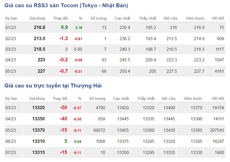 Ngày 10/1/2023, giá cao su RSS3 giao kỳ hạn gần ở mức 13.170 nhân dân tệ/tấn (tương đương 1,95 USD/kg), tăng 2,3% so với cuối tháng 12/2022, nhưng vẫn giảm 12,5% so với cùng kỳ năm 2022.