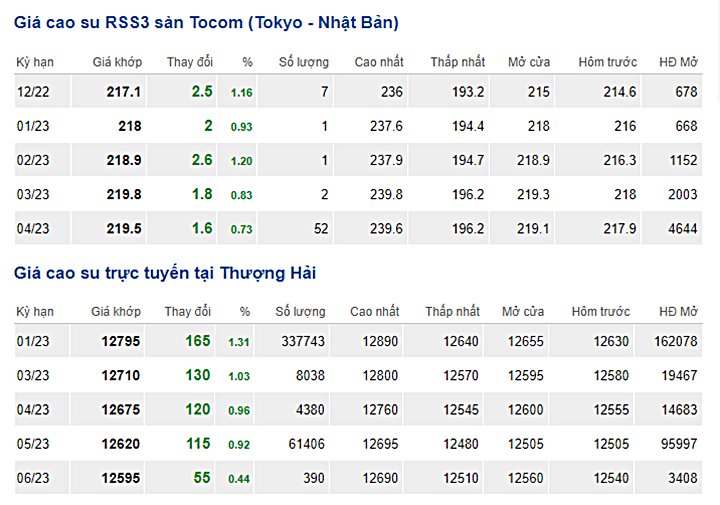 Và giá cao su giao tháng 3/2023 trên sàn này cũng đang tăng thêm 0,83% (tương đương 1,8 yen/kg), lên mức 219,8 yen/kg.