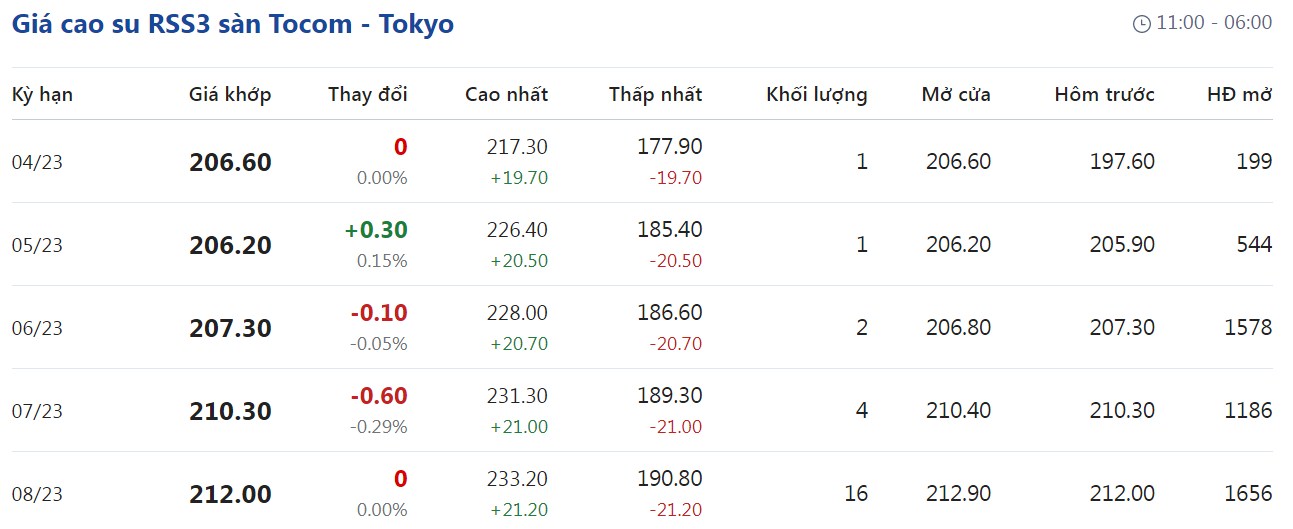 Tại Sở giao dịch hàng hóa Tokyo (TOCOM), giá cao su kỳ hạn giao tháng 4/2023 đạt mức 206,6 yen/kg, tiếp tục duy trì ổn định so với hôm qua tại thời điểm khảo sát vào lúc 6h15 (giờ Việt Nam).