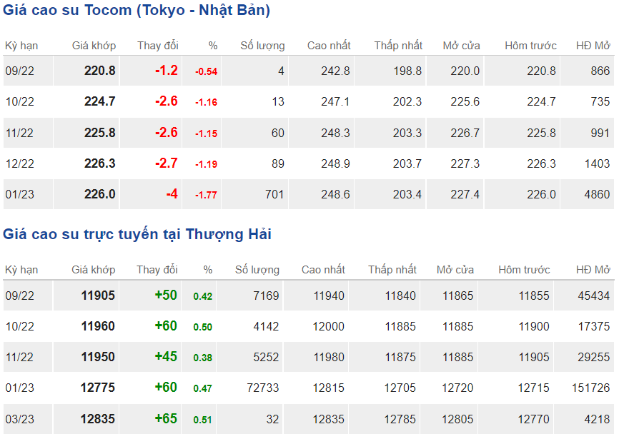 Giá cao su trên Sàn giao dịch Thượng Hải (SHFE) đảo chiều tăng trở lại. Giá cao su trên sàn Tokyo (TOCOM) tiếp tục giảm thêm.