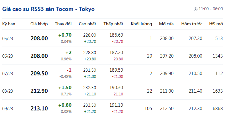 Tại Sở giao dịch hàng hóa Tokyo (TOCOM), giá cao su kỳ hạn giao tháng 5/2023 đạt mức 208 yen/kg, tăng 0,34% (tương đương 0,7 yen/kg) tại thời điểm khảo sát vào lúc 6h15 (giờ Việt Nam).