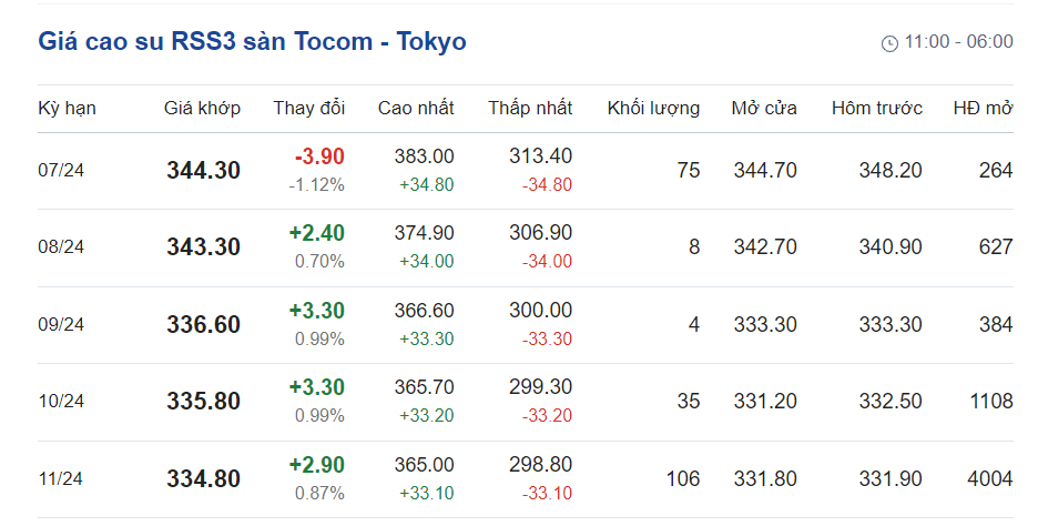 Tại Sở giao dịch hàng hóa Tokyo (TOCOM), giá cao su giao kỳ hạn tháng 7/2024 giảm 1,12% xuống mức 344,3 yen/kg tại thời điểm khảo sát vào lúc 6h00 (giờ Việt Nam).