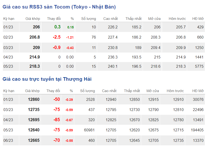 Giá cao su thế giới, tại Sở giao dịch hàng hóa Tokyo (TOCOM), giá cao su kỳ hạn giao tháng 1/2023 đạt mức 206 yen/kg, tăng 0,15% (tương đương 0,3 yen/kg) tại thời điểm khảo sát vào lúc 7h10 (giờ Việt Nam).
