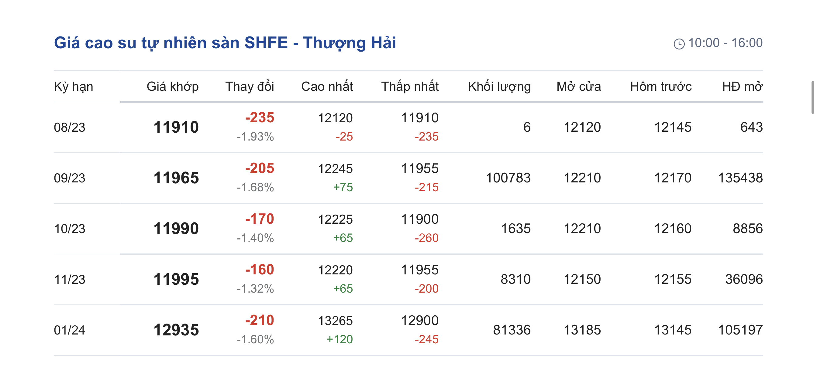 Trên Sàn giao dịch hàng hóa tương lai Thượng Hải (SHFE), giá cao su RSS3 giao kỳ hạn tháng 8/2023 được điều chỉnh xuống mức 11.910 nhân dân tệ/tấn, giảm 1,93% (tương đương 235 nhân dân tệ) so với giao dịch trước đó.