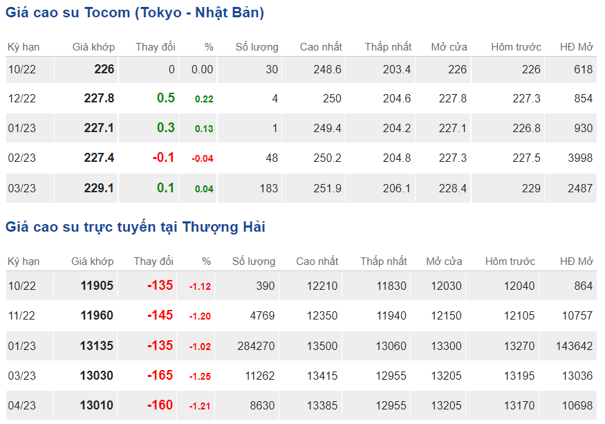 Tại Sở giao dịch hàng hóa Tokyo (TOCOM), giá cao su kỳ hạn giao tháng 10/2022 đứng mức 226 yen/kg, tại thời điểm khảo sát vào lúc 6h50 (giờ Việt Nam).