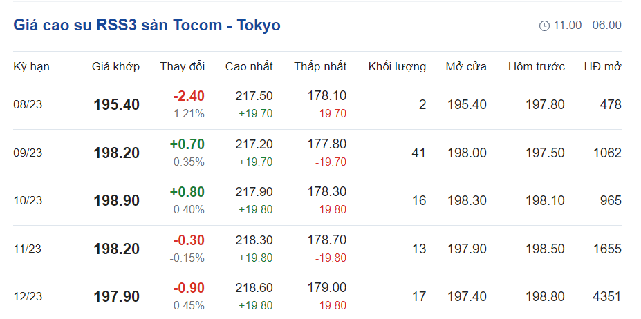 Tại Sở giao dịch hàng hóa Tokyo (TOCOM), giá cao su kỳ hạn giao tháng 8/2023 đạt mức 195,4 yen/kg, giảm 1,21% (tương đương 2,4 yen/kg) tại thời điểm khảo sát vào lúc 7h00 (giờ Việt Nam).