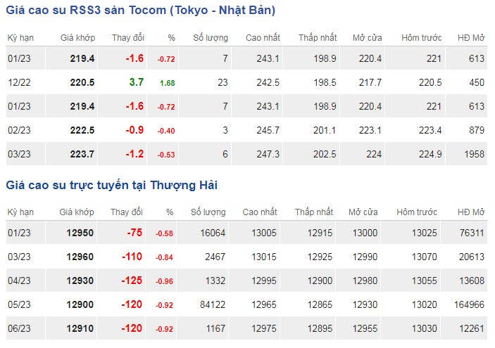 Tại Sở giao dịch hàng hóa Tokyo (TOCOM), giá cao su kỳ hạn giao tháng 1/2023 đạt mức 219,4 yen/kg, giảm 0,72% (tương đương 1,6 yen/kg) tại thời điểm khảo sát vào lúc 7h30 (giờ Việt Nam).