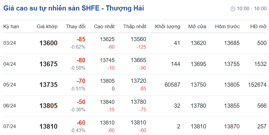 Trên Sàn giao dịch hàng hóa tương lai Thượng Hải (SHFE), giá cao su RSS3 giao kỳ hạn tháng 3/2024 được điều chỉnh xuống mức 13.590 nhân dân tệ/tấn, giảm 0,69% so với giao dịch trước đó.