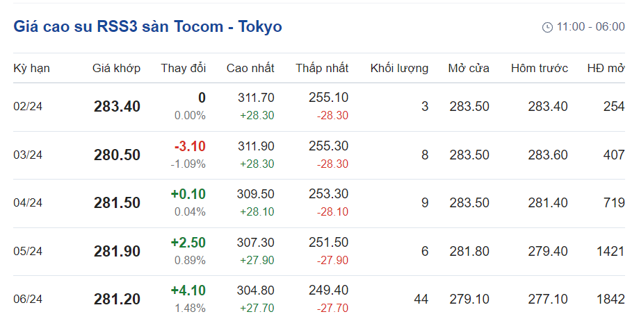 Tại Sở giao dịch hàng hóa Tokyo (TOCOM), giá cao su kỳ hạn giao tháng 2/2024 đạt mức 283,4 yen/kg, tăng 0,04% (tương đương 0,1 yen/kg) tại thời điểm khảo sát vào lúc 6h00 (giờ Việt Nam).