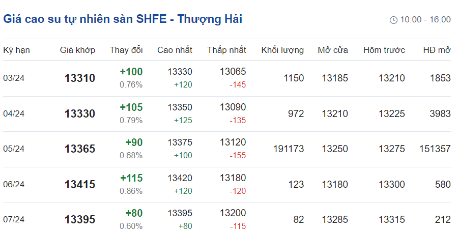 Trên Sàn giao dịch hàng hóa tương lai Thượng Hải (SHFE), giá cao su RSS3 giao kỳ hạn tháng 3/2024 được điều chỉnh lên mức 13.310 nhân dân tệ/tấn, tăng 0,76% (tương đương 100 nhân dân tệ) so với giao dịch.
