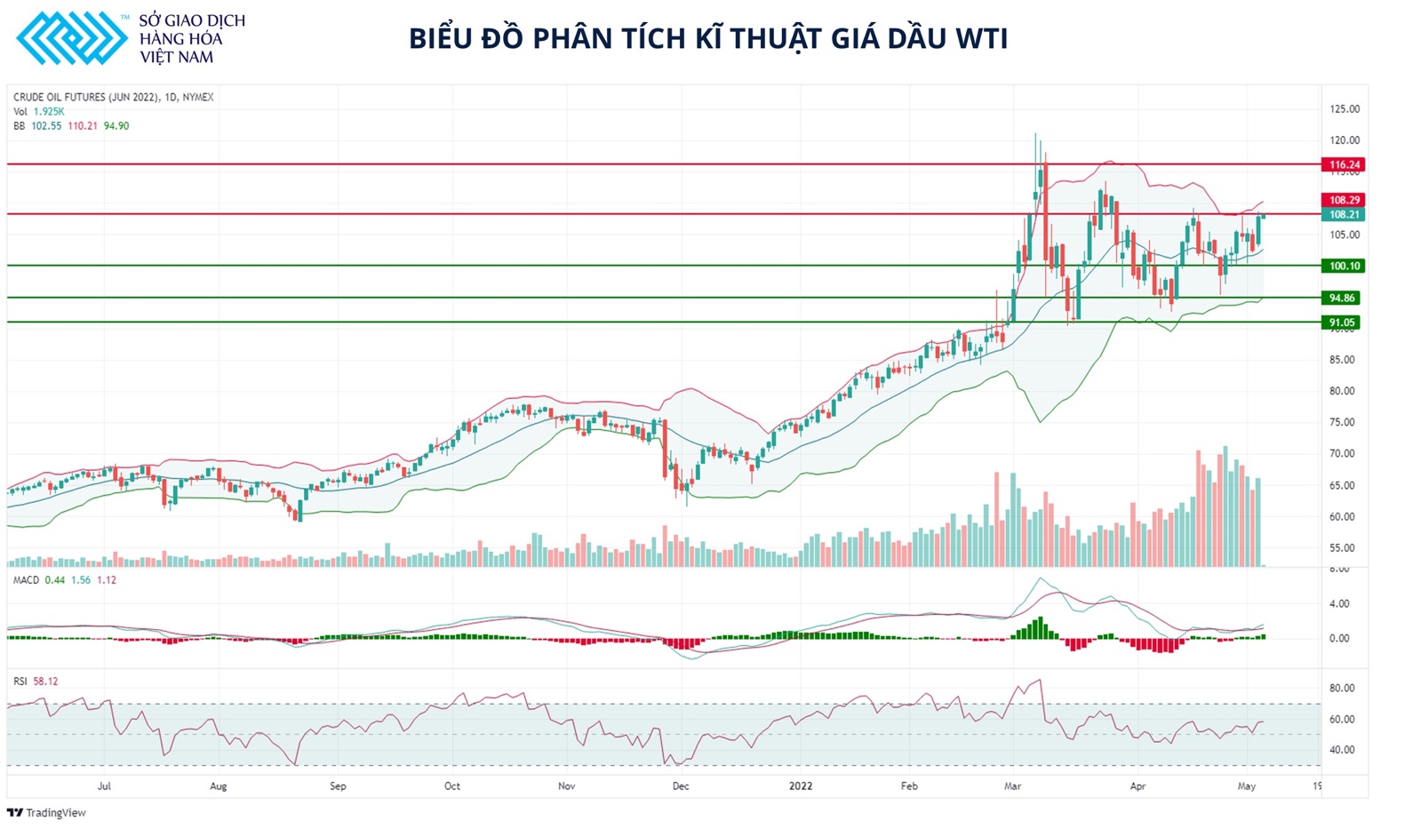 Về mặt kỹ thuật, giá dầu đang chịu áp lực tại kháng cự vùng 108 USD/thùng, tuy nhiên các chỉ số như MACD, RSI vẫn đang khá tích cực. Giá có thể sẽ điều chỉnh về vùng 106.5 USD/thùng trước khi quay trở lại đà tăng.