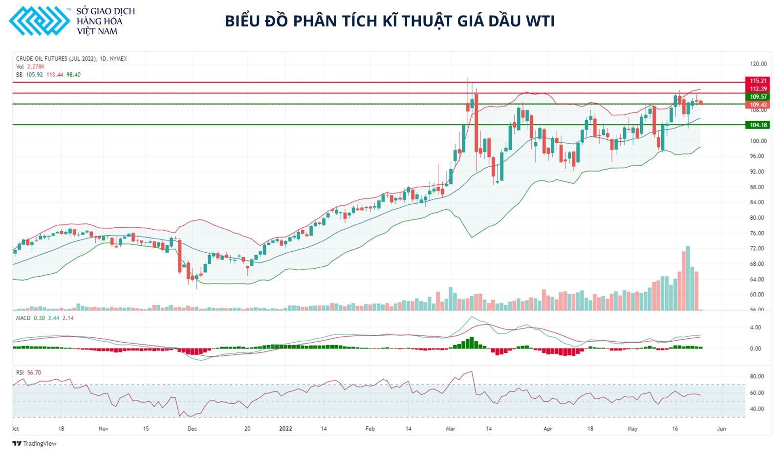 Trên biểu đồ kỹ thuật, giá WTI kỳ hạn tháng 07/2022 đang test lại hỗ trợ ở vùng 109,5 USD/thùng. Các chỉ số kỹ thuật không đưa ra được tín hiệu rõ ràng, với RSI và MACD đều có dấu hiệu đi ngang trong vùng trung tính. Có thể mở lệnh bán tại vùng 109.5 USD/thùng và chốt lời ngắn 1 USD/thùng.