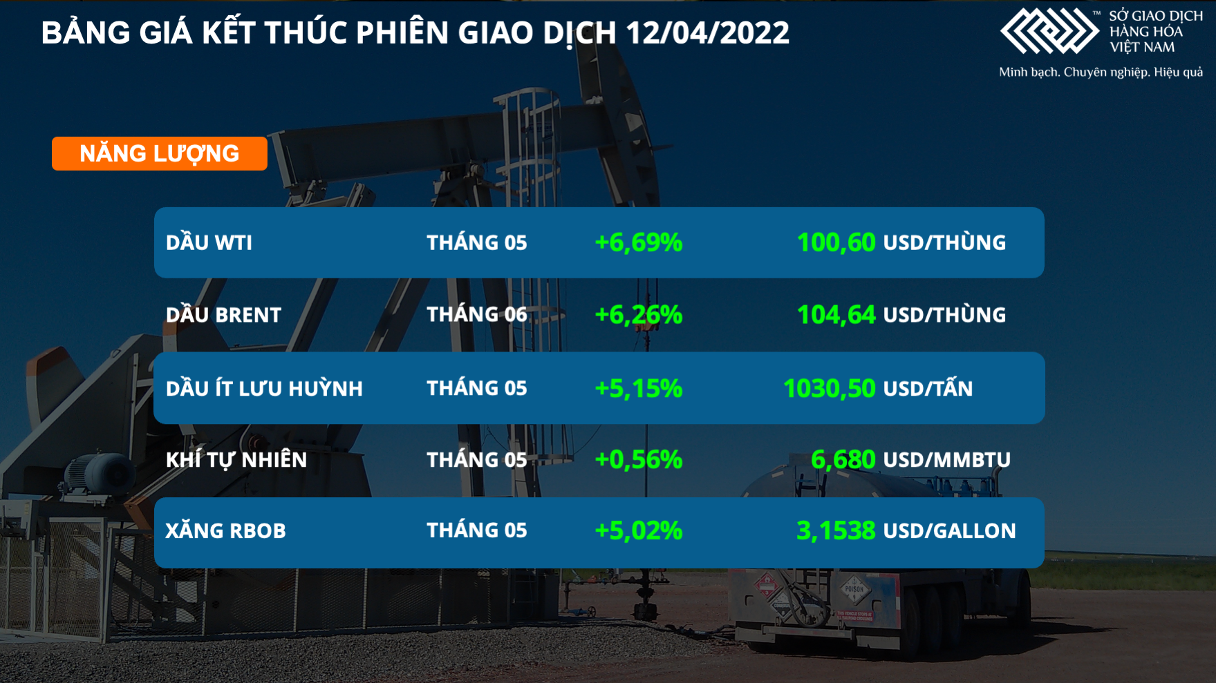 Bảng giá dầu kết thúc phiên giao dịch 12/4 (Nguồn: Sở giao dịch Hàng hóa Việt Nam)