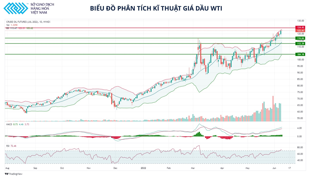 Về mặt kỹ thuật, RSI và MACD đều đã bước vào vùng quá mua, trong khi giá chạm cạnh trên của Bollinger Bands tiếp tục mở rộng. Giá có thể thách thức lại vùng 122-122.5 USD/thùng, tuy nhiên nhiều khả năng sẽ gặp lực bán chốt lời.