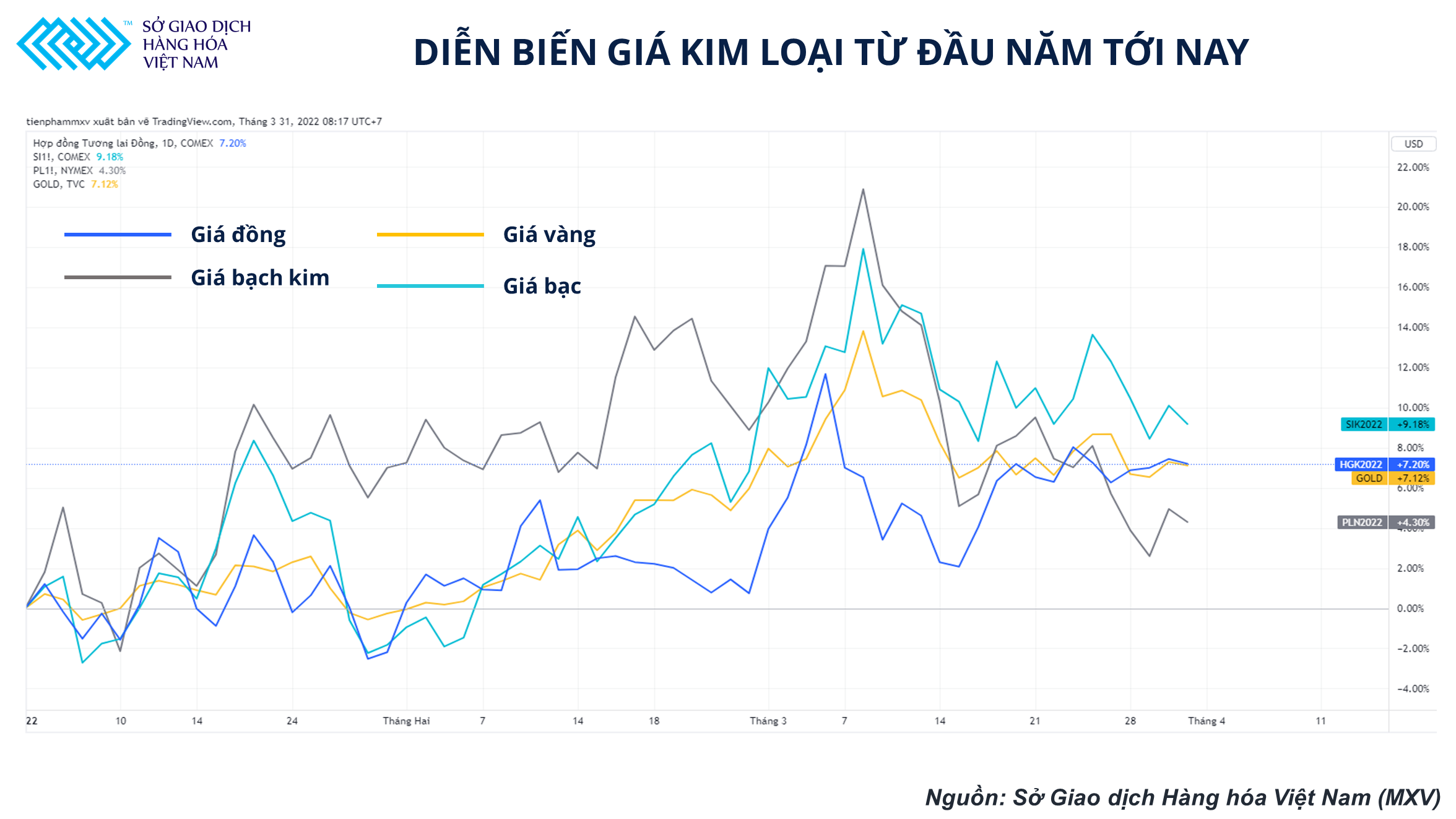 Diễn biến giá kim loại từ đầu năm tới nay (Nguồn: Sở giao dịch Hàng hóa Việt Nam)