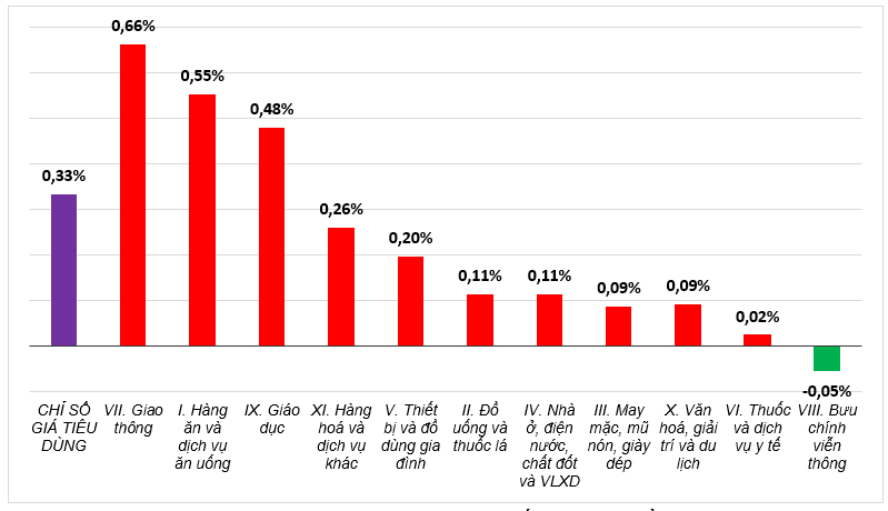 - Nhóm giao thông tăng mạnh nhất với 0,66% (tác động làm CPI chung tăng 0,06 điểm phần trăm), chủ yếu do: Giá dầu diezen tăng 2,27%; giá xăng trong nước tăng 0,98% do ảnh hưởng của các đợt điều chỉnh giá trong tháng. Giá vận tải hành khách bằng đường hàng không tăng 32,75% do nhu cầu của người tiêu dùng tăng; giá phụ tùng khác của xe đạp tăng 0,48%; sửa chữa xe máy tăng 0,45%; sửa chữa xe đạp tăng 0,27%; phụ tùng khác của xe máy tăng 0,25%; lốp, săm xe đạp tăng 0,21%; lốp, săm xe máy tăng 0,19%. Bên cạnh đó, có một số mặt hàng giảm giá: Giá xe ô tô mới và giá vận tải hành khách bằng đường bộ cùng giảm 0,1%; xe ô tô đã qua sử dụng giảm 0,23%.
