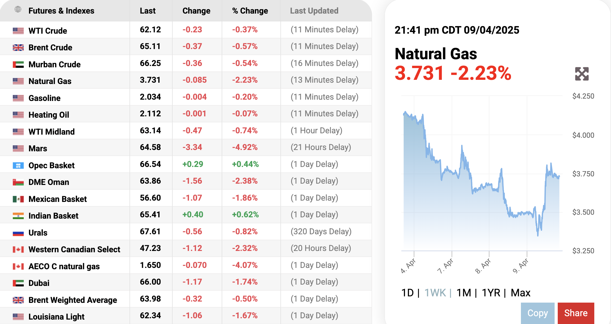 Ghi nhận trên trang Oilprice.com vào lúc 09h41 ngày 10/4/2025 (giờ Việt Nam), giá khí tự nhiên thế giới tiếp tục giảm mạnh 2,23% (tương đương tăng 0,089 USD) lên mức 3.731 USD/mmBTU tại thời điểm khảo sát.