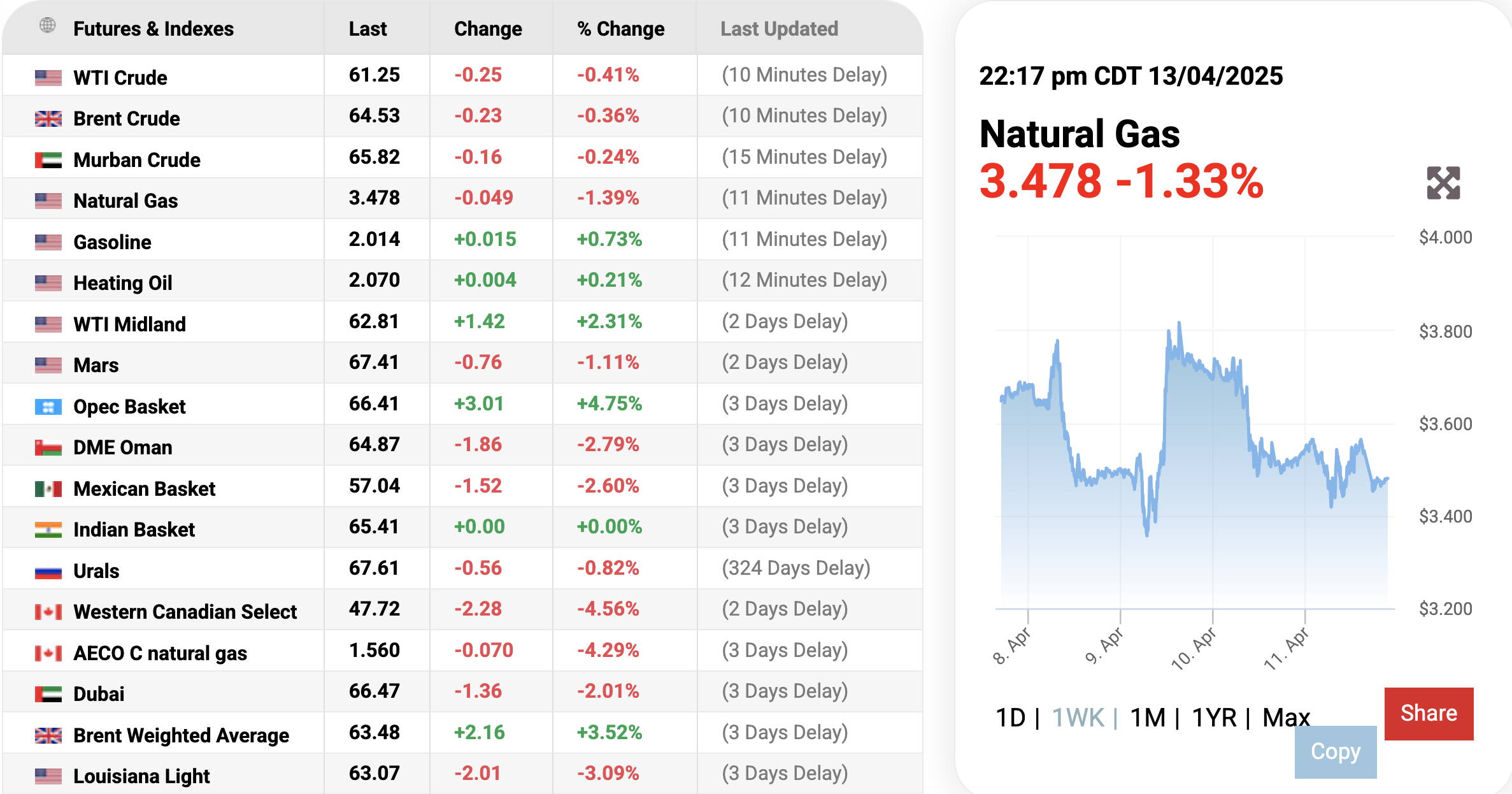 Ghi nhận trên trang Oilprice.com vào lúc 10h17 ngày 14/4/2025 (giờ Việt Nam), giá khí tự nhiên thế giới tiếp tục giảm mạnh 1,33% (tương đương giảm 0,049 USD) xuống mức 3.478 USD/mmBTU tại thời điểm khảo sát.