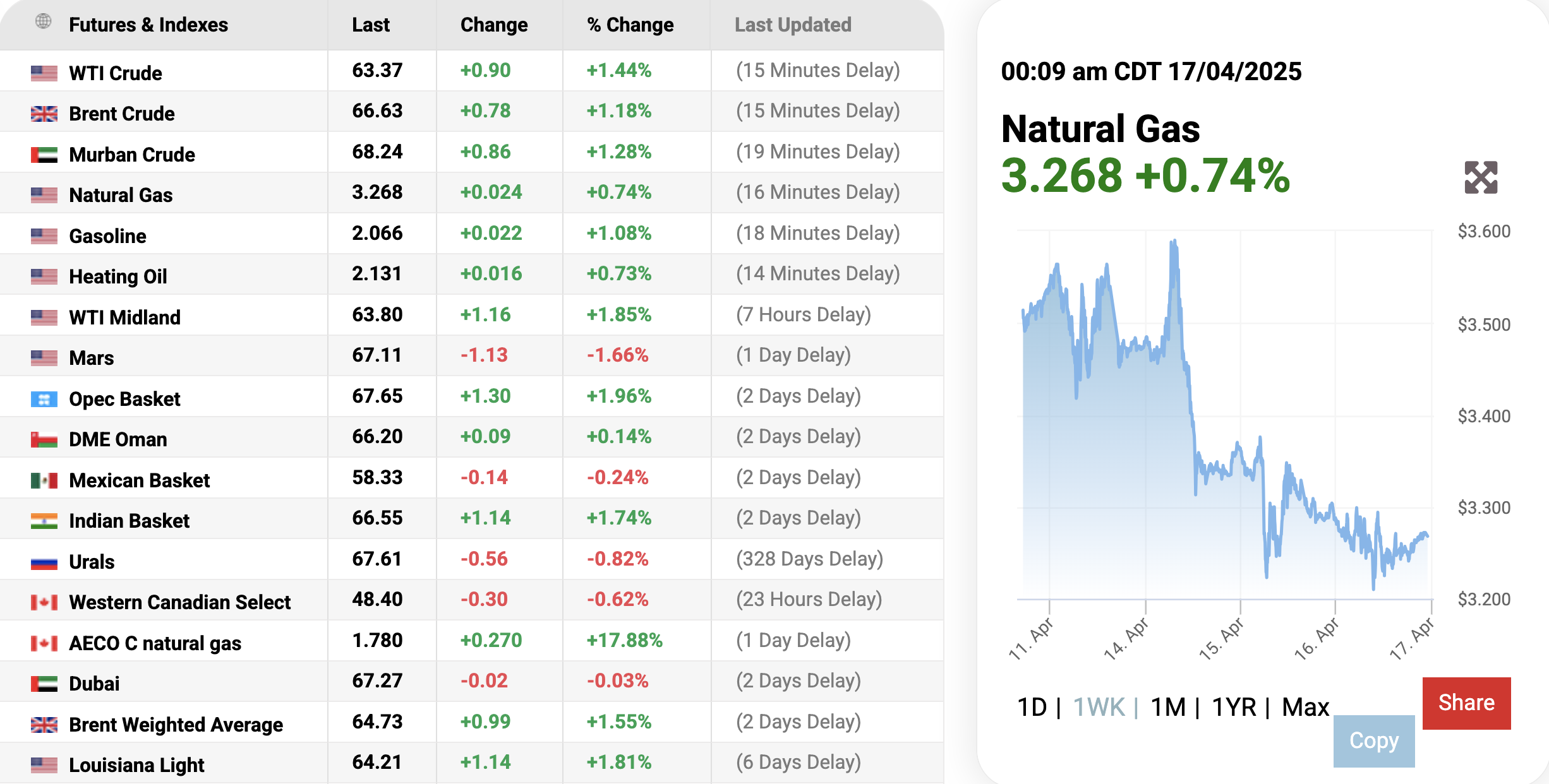 Ghi nhận trên trang Oilprice.com vào lúc 12h09 ngày 17/4/2025 (giờ Việt Nam), giá khí tự nhiên thế giới đảo tiếp tục tăng nhẹ 0,74% (tương đương tăng 0,024 USD) lên mức 3.268 USD/mmBTU tại thời điểm khảo sát.