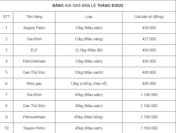 Ở thị trường trong nước, Công ty TNHH một thành viên Dầu khí TP.HCM (Saigon Petro) thông báo, từ ngày 1/8, giá bán gas SP giảm 1.542 đồng/kg (đã VAT), tương đương giảm 18.500 đồng/bình 12kg. Với mức giảm này, giá bán lẻ gas SP đến tay người tiêu dùng trong tháng 8 sẽ ở mức 430.500 đồng/bình 12kg và bình 45kg ở mức 1.190.000 đồng.