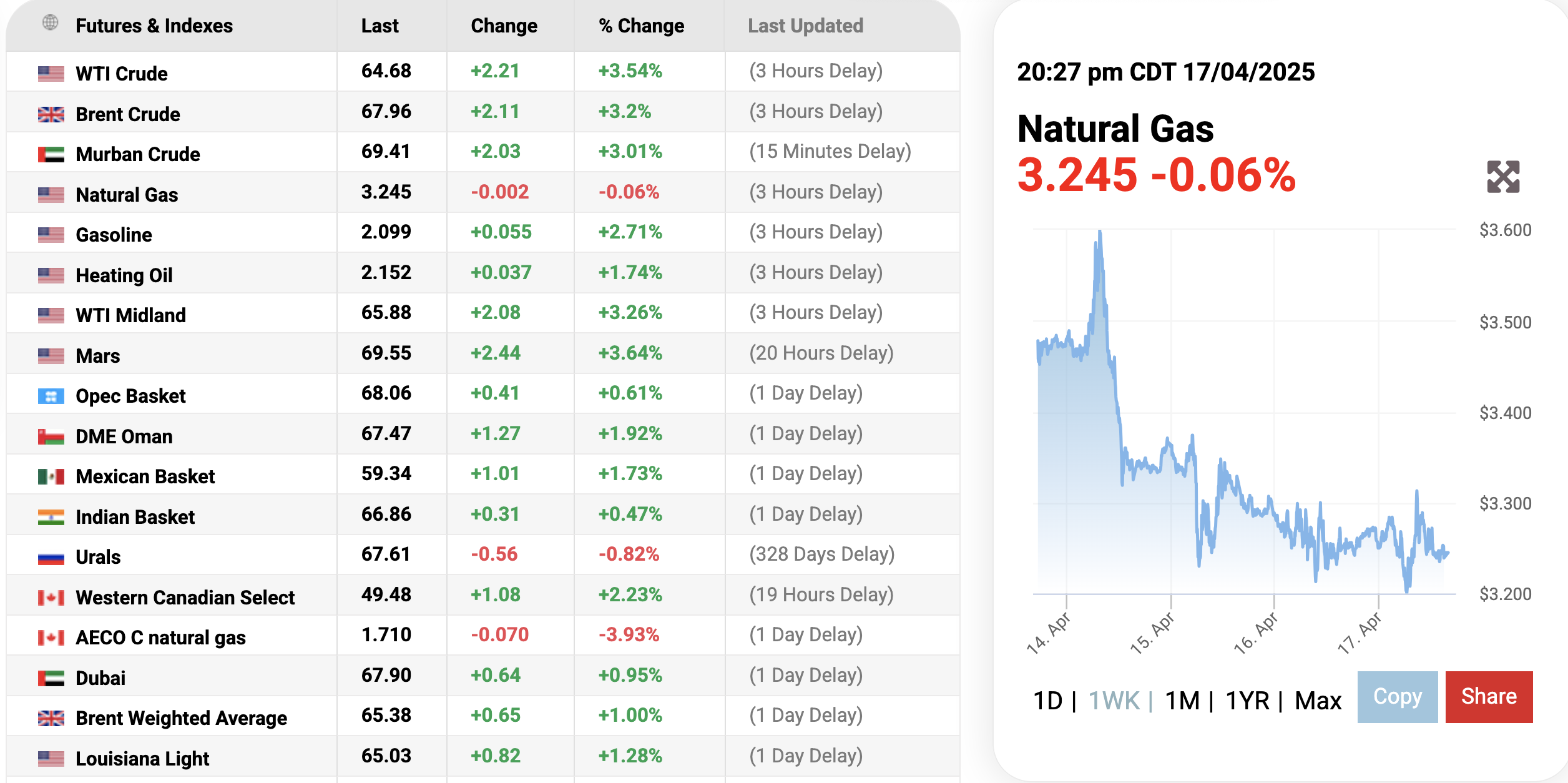 Ghi nhận trên trang Oilprice.com vào lúc 08h27 ngày 18/4/2025 (giờ Việt Nam), giá khí tự nhiên thế giới đảo chiều giảm nhẹ 0,07% (tương đương giảm 0,002 USD) xuống mức 3.245 USD/mmBTU tại thời điểm khảo sát.