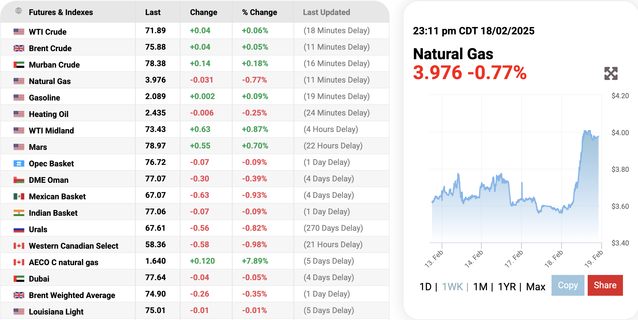 Ghi nhận trên trang Oilprice.com vào lúc 11h11 phút ngày 19/2/2025 (giờ Việt Nam), giá khí tự nhiên thế giới giảm 0,77% (tương đương 0,031 USD) xuống mức 3.973 USD/mmBTU.