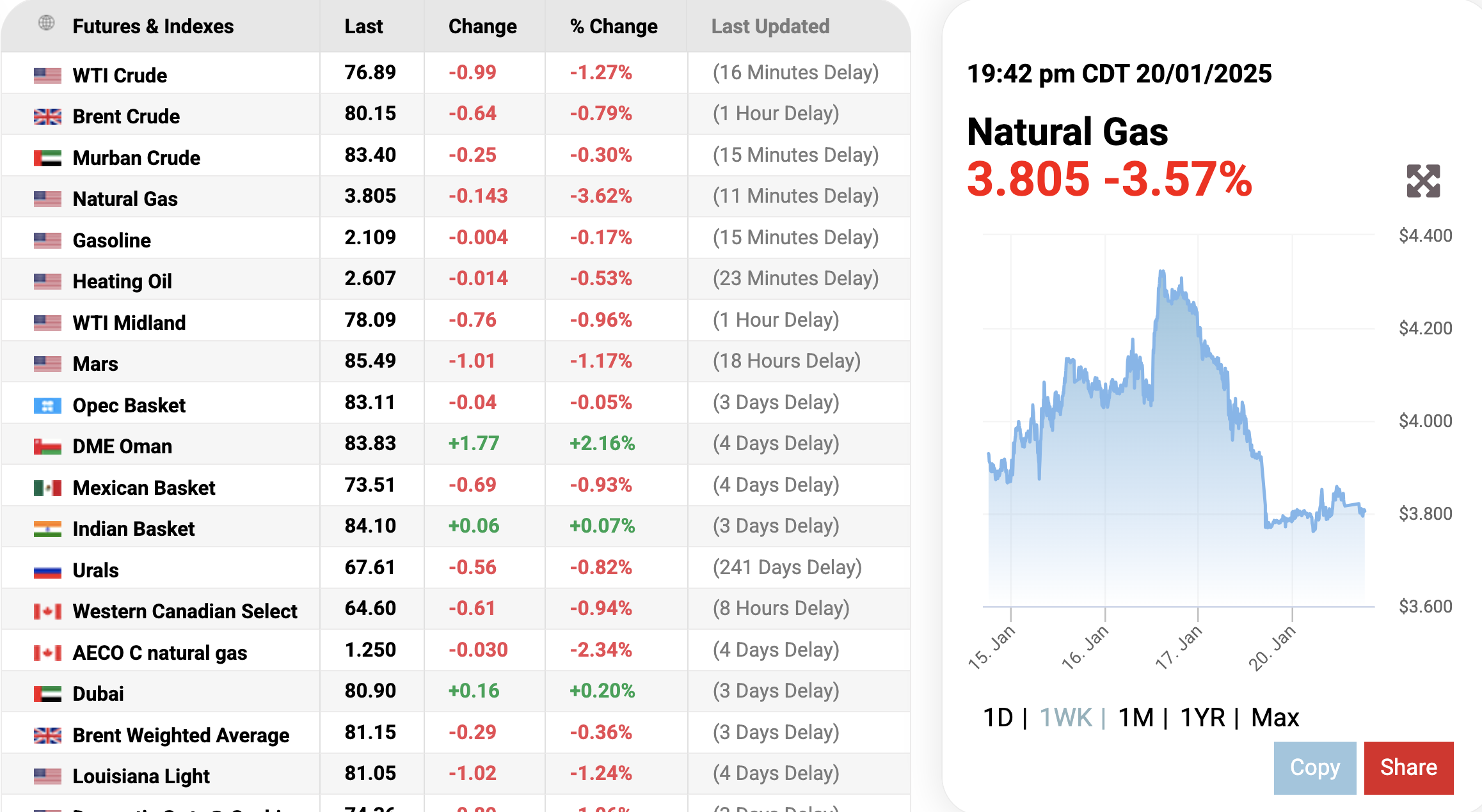 Theo ghi nhận trên trang Oilprice.com vào lúc 07 giờ 42 phút ngày 21/1/2025 (giờ Việt Nam), giá khí tự nhiên trên thị trường thế giới đảo chiều giảm mạnh 4,2% xuống mức 3.781 USD/mmBTU đối với hợp đồng khí gas tự nhiên giao tháng 1/2025.