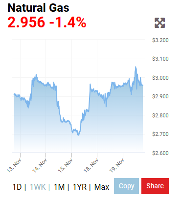 Trên thị trường thế giới, giá khí đốt tự nhiên tiếp đà giảm hơn 1% trong phiên giao dịch sáng 20/11. Trong khi đó, giá khí đốt ở châu Âu tăng mạnh do Nga ngừng cung cấp khí đốt cho tập đoàn năng lượng OMV của Áo khiến nguồn cung giảm và giá cả tăng mạnh.