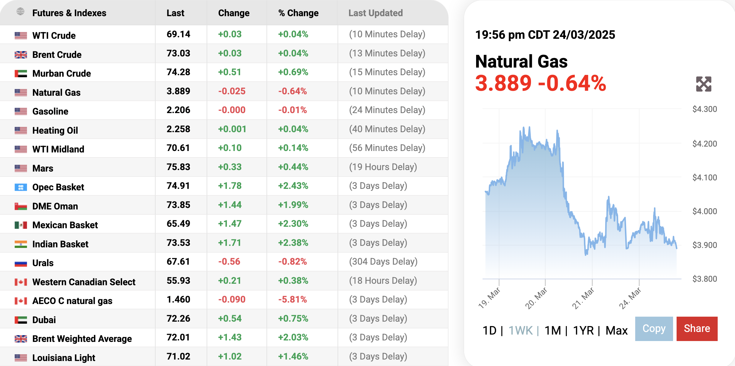 Ghi nhận trên trang Oilprice.com vào lúc 07h56 ngày 25/3/2025 (giờ Việt Nam), giá khí tự nhiên thế giới giảm 0,64% (tương đương giảm 0,025 USD) xuống mức 3.889 USD/mmBTU sau khi giảm mạnh.