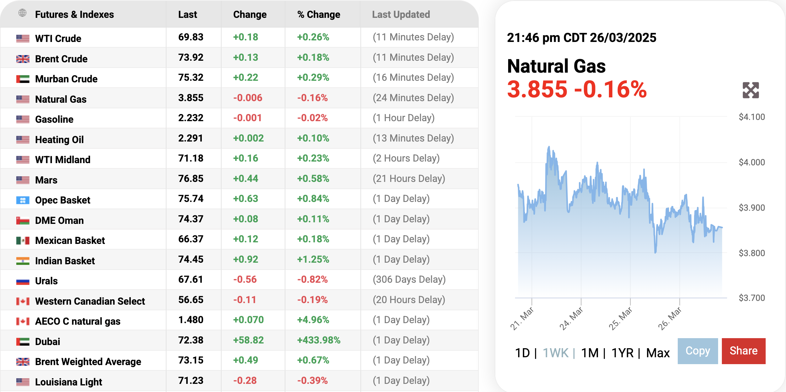 Ghi nhận trên trang Oilprice.com vào lúc 09h46 ngày 27/3/2025 (giờ Việt Nam), giá khí tự nhiên thế giới đảo chiều giảm nhẹ 0,16% (tương đương giảm 0,006 USD) xuống mức 3.855 USD/mmBTU tại thời điểm khảo sát.