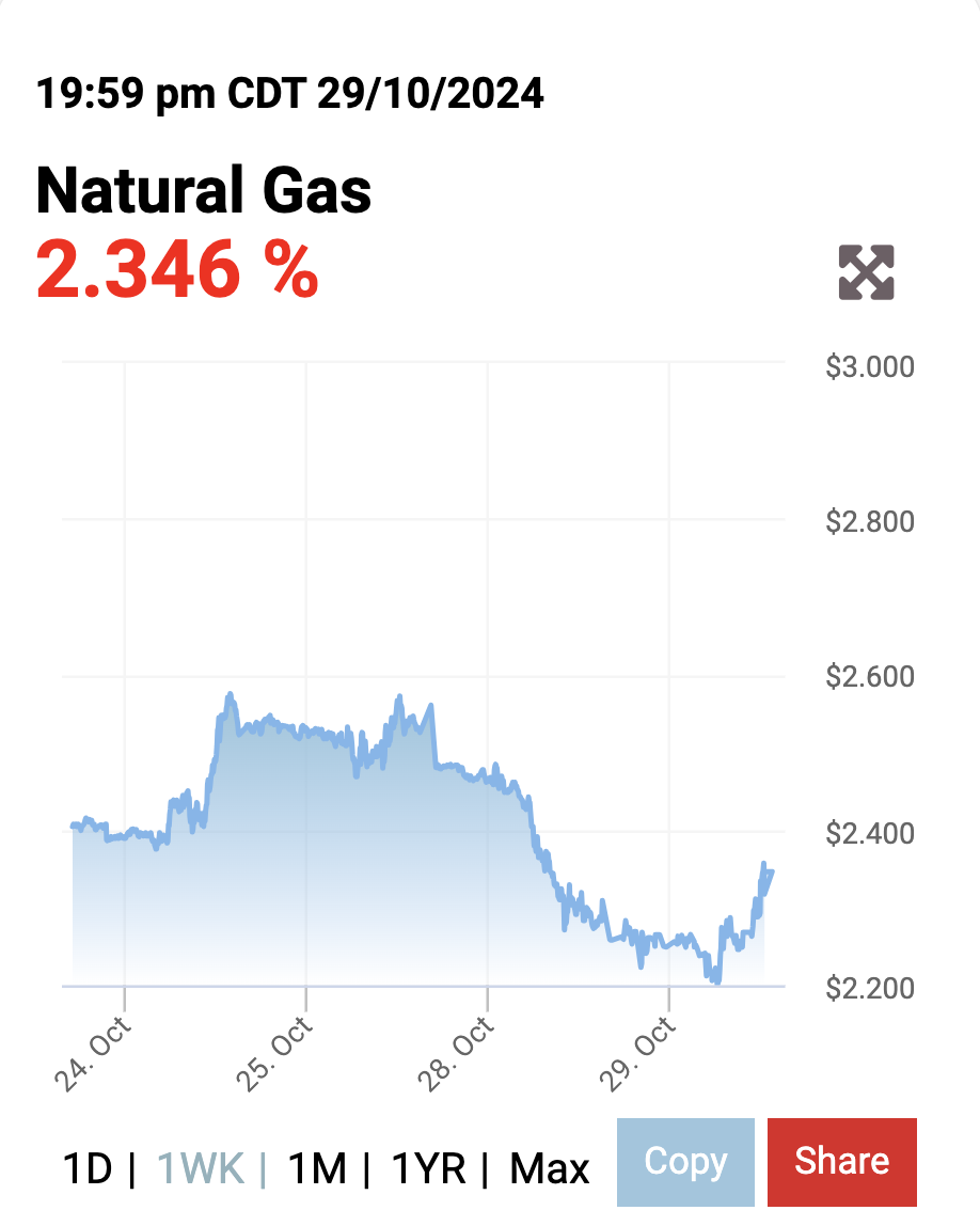 Ghi nhận trên Oilprice lúc 8h00 ngày 30/10 (giờ Việt Nam), giá khí tự nhiên trên thị trường thế giới quay đầu tăng mạnh 1,6% lên mức 2,346 USD/mmBTU đối với hợp đồng khí gas tự nhiên giao tháng 12/2024.