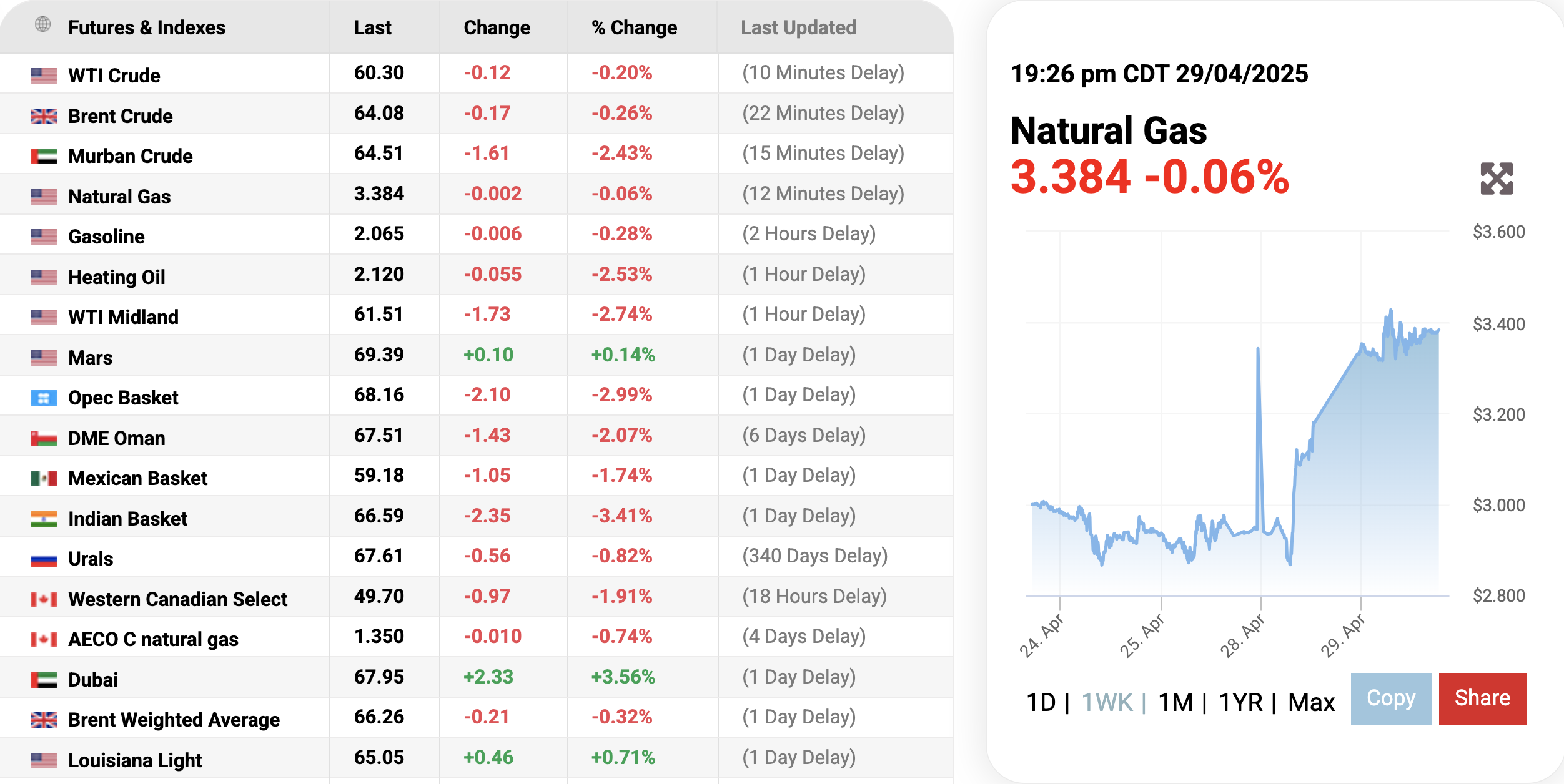 Ghi nhận trên trang Oilprice.com vào lúc 07h26 ngày 30/4/2025 (giờ Việt Nam), giá khí tự nhiên thế giới đảo chiều giảm nhẹ 0.06% (tương đương giảm 0,002 USD) xuống mức 3.384 USD/mmBTU tại thời điểm khảo sát.