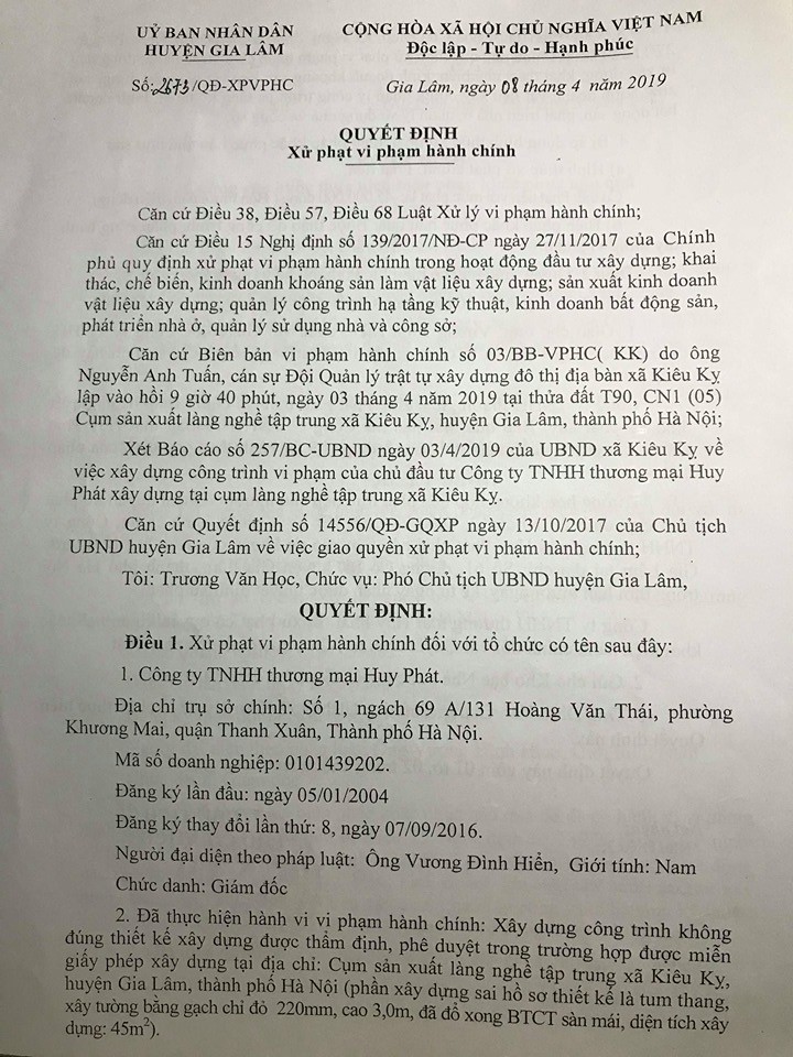 Quyết định xử phạt về việc xây dựng sai quy hoạch tại Cụm sản xuất làng nghề tập trung Kiêu Kỵ