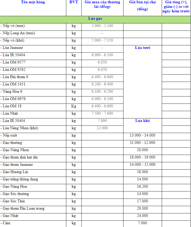 Các loại gạo như: Nếp ruột, hương lài, thơm thái hạt dài… cũng không biến động. Hiện nếp ruột 13.000 - 14.000 đồng/kg; gạo thơm thái dạt dài 18.000 - 19.000 đồng/kg; Hương lài 18.000 đồng/kg; Jasmine 14.000 - 15.000 đồng/kg; gạo trắng thông dụng 14.000 đồng/kg; nàng Hoa 16.200 đồng/kg; Sóc thường 14.000 đồng/kg, gạo trắng thường ổn định ở mức 11.000 - 12.000 đồng/kg, gạo Nhật 24.000 đồng/kg; gạo nàng Nhen 20.000 đồng/kg. Như vậy, kể từ đầu tháng 5 tới nay, các loại gạo này không tăng cũng không giảm.