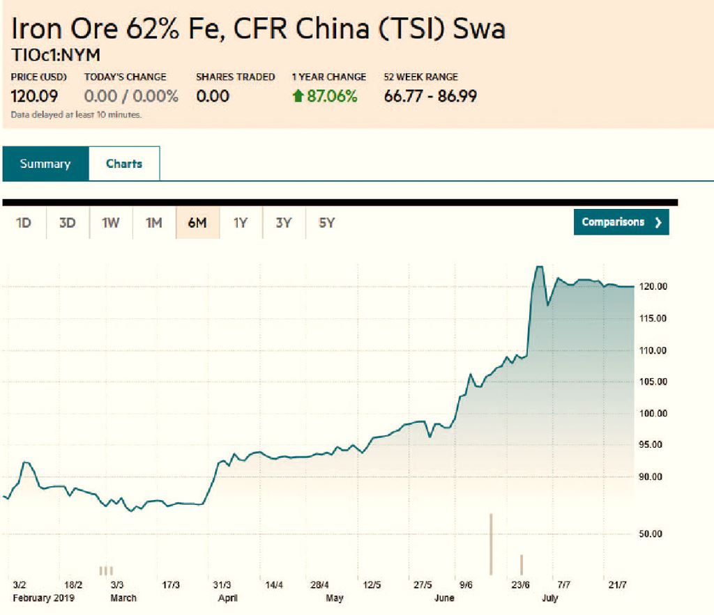 Việc giá vốn của các doanh nghiệp ngành thép đội lên cao không khó hiểu. Theo dữ liệu giá thép trên Financial Times, tại Trung Quốc, giá quặng sắt đang liên tục lập đỉnh mới. Thị trường quặng sắt ghi nhận quý II/2019 là quý tăng giá mạnh nhất kể từ cuối năm 2016.
