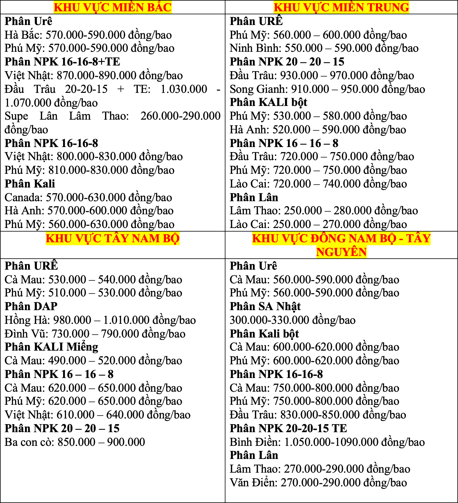 Bảng giá phân bón mới nhất ngày 11/9. (Nguồn: 2 Nông/Chợ giá).