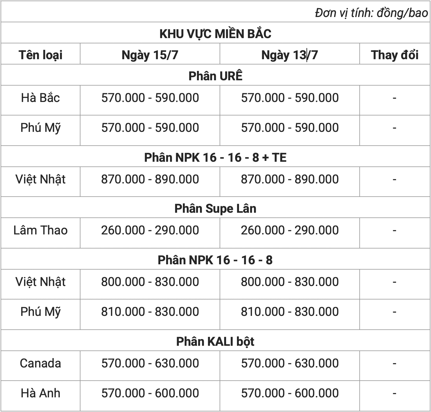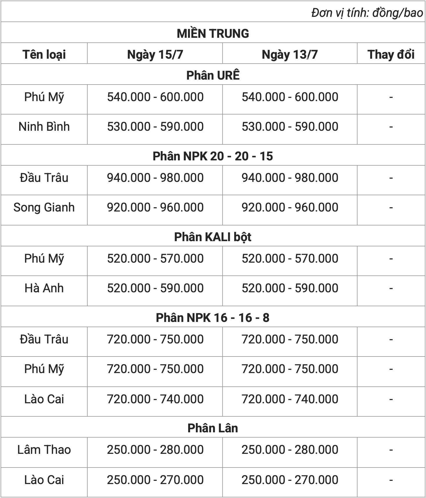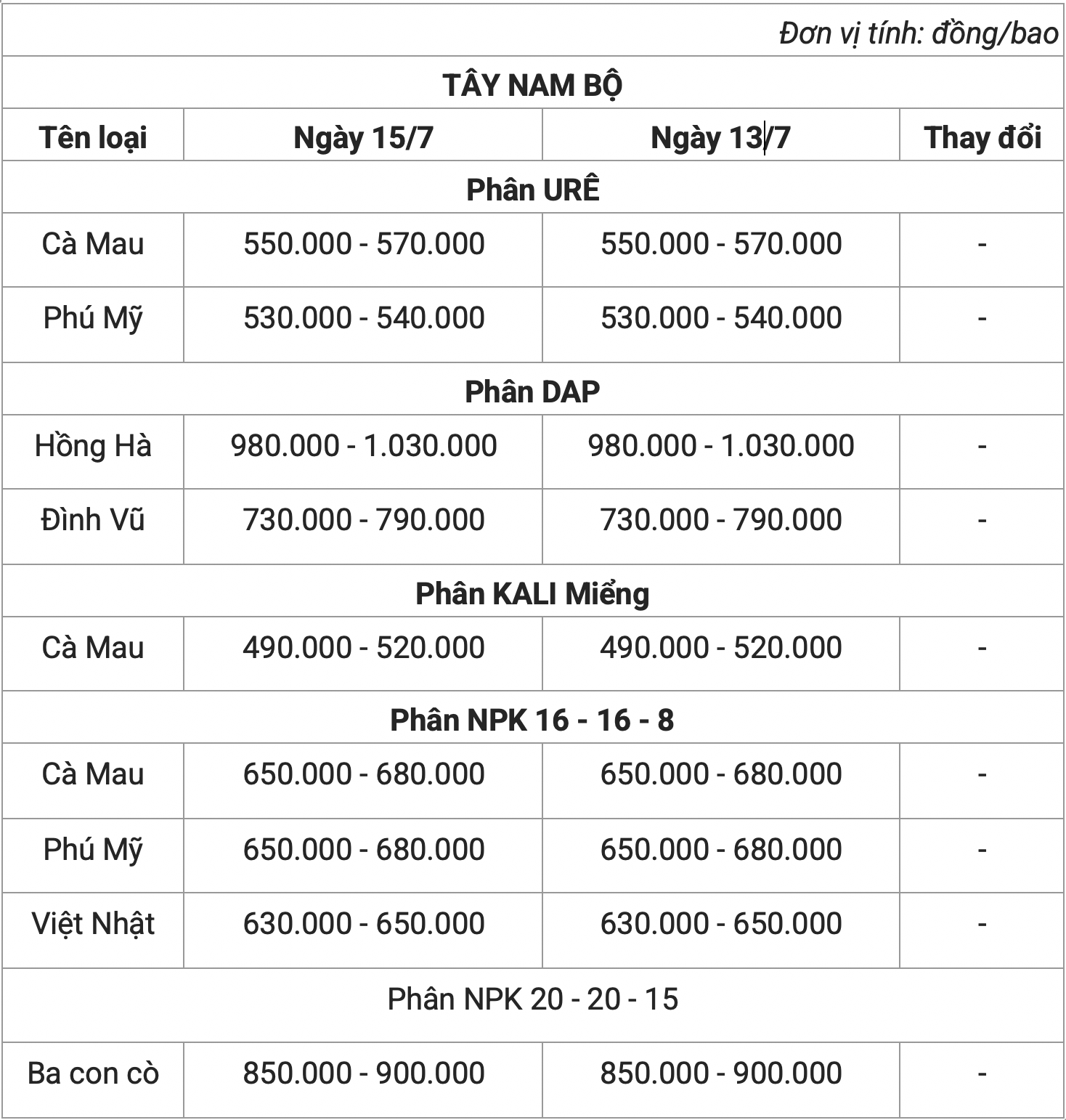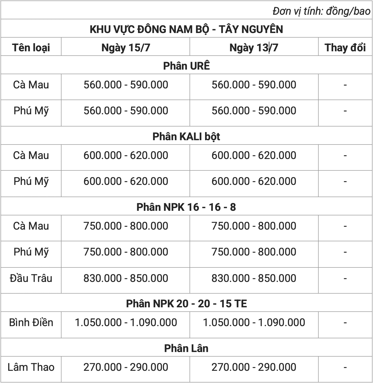 Theo khảo sát, giá phân bón hôm nay (15/7) lặng sóng. Theo đó, phân urê có mức giá đi ngang, dao động khoảng 560.000 - 590.000 đồng/bao.