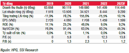 SSI Research điều chỉnh nhẹ dự báo doanh thu và lợi nhuận ròng năm 2023 lần lượt từ 121 nghìn tỷ đồng và 9,7 nghìn tỷ đồng xuống 114,5 nghìn tỷ đồng (-19,8% so với cùng kỳ) và 9,3 nghìn tỷ đồng (+10% so với cùng kỳ), chủ yếu do giảm dự báo sản lượng tiêu thụ thép xây dựng từ 4,1 triệu tấn xuống 3,8 triệu tấn (-11,2% so với cùng kỳ), và phôi thép từ 240 nghìn tấn xuống 160 nghìn tấn (-44% so với cùng kỳ).
