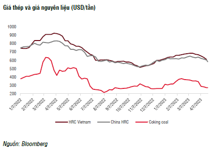 SSI Research cho rằng giá thép sẽ chịu áp lực trong ngắn hạn theo xu hướng của giá thép và giá nguyên liệu trong khu vực. Giá than đã giảm gần 30% kể từ mức đỉnh vào tháng 2. Ngoài ra, mức điều chỉnh giá thép trong nước gần đây (giảm 5%, tương đương khoảng 700 nghìn đồng/tấn) thấp hơn nhiều so với mức điều chỉnh giá phôi thép (giảm 18%, tương đương 2,7 triệu đồng/tấn) trong hai tháng qua.