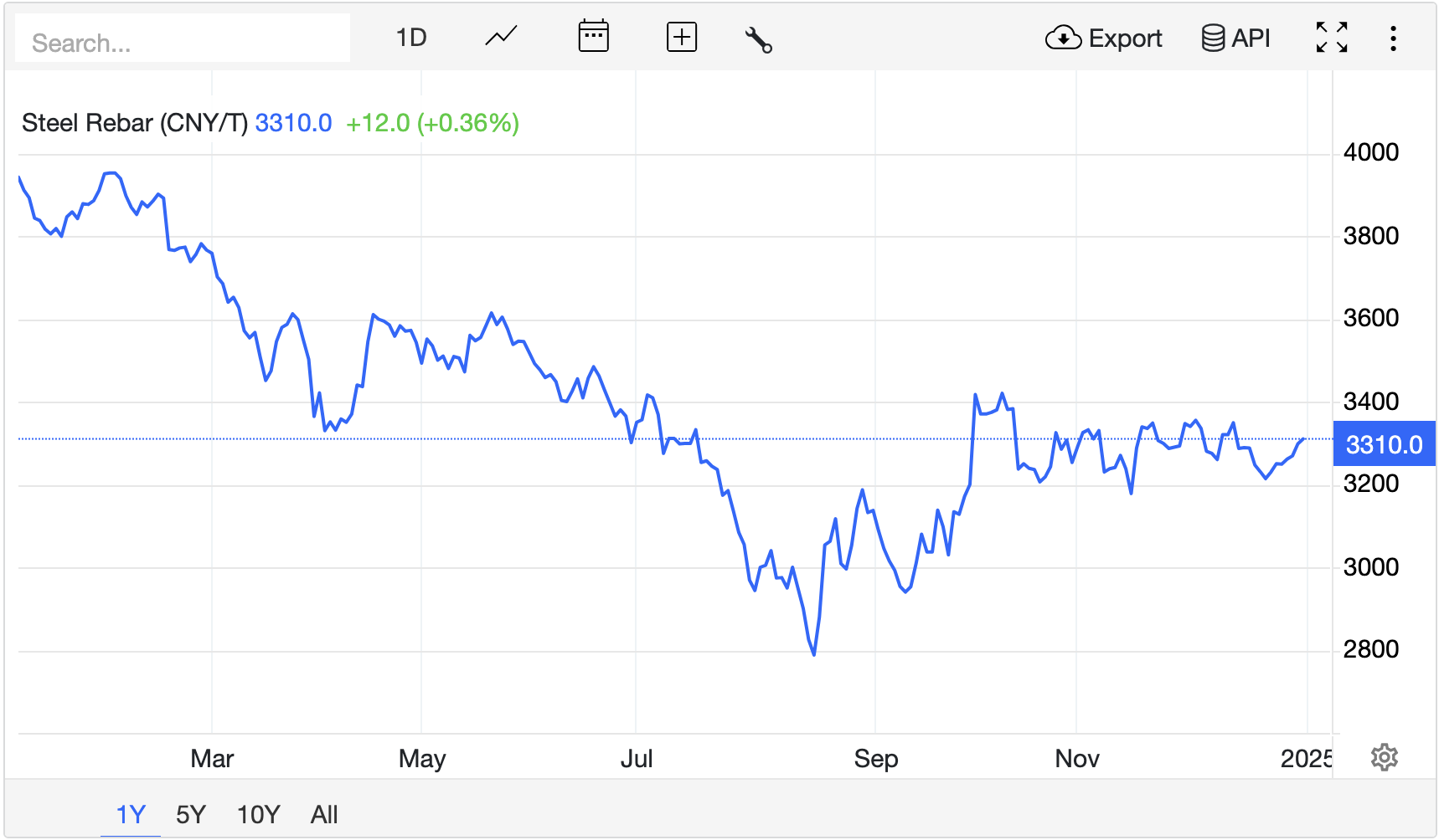 Quặng sắt, nguyên liệu quan trọng trong sản xuất thép, là một trong những mặt hàng có hiệu suất kinh doanh kém nhất trong năm qua. Nền kinh tế ảm đạm của Trung Quốc cùng cuộc khủng hoảng bất động sản kéo dài đã ảnh hưởng lớn đến nhu cầu. Phần lớn mức giảm diễn ra trong quý đầu năm, và giá chạm mức thấp nhất kể từ năm 2022 vào tháng 9.