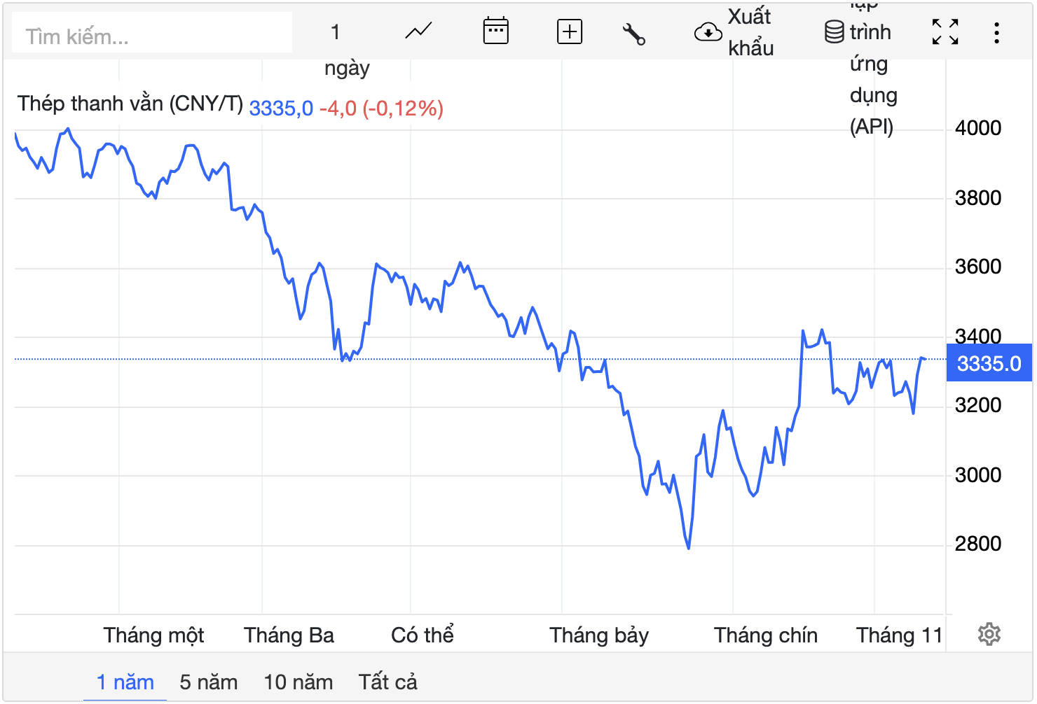 Theo trang Trading Economics.com, giá thép thép thanh Trung Quốc hôm nay trên sàn giao dịch Thượng Hải giảm nhẹ 0,12% xuống mức 3.335 CNY/tấn.