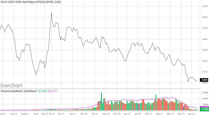 Diễn biến giá thép thanh kỳ hạn tháng 5 trên Sàn Thượng Hải. Nguồn: Barchart