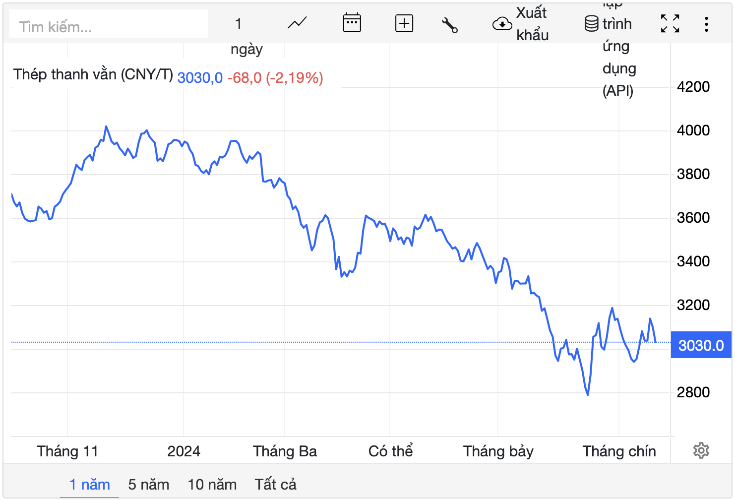 Giá thép thép thanh giao tháng 9/2024 trên Sàn giao dịch Thượng Hải ghi nhận ở mức 3.030 nhân dân tệ/tấn, giảm 2,19% tại thời điểm khảo sát vào lúc 6h50 ngày 24/9 (theo giờ Việt Nam).