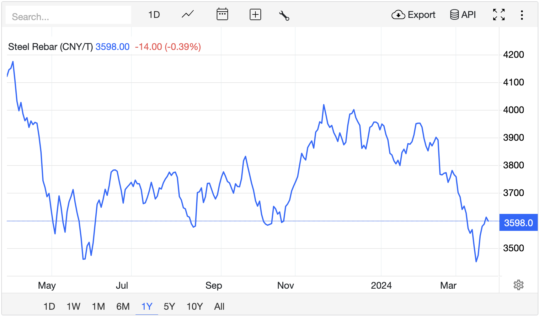 Giá thép giao tháng 5/2024 trên Sàn giao dịch Thượng Hải giảm 14 nhân dân tệ xuống mức 3.598 nhân dân tệ/tấn tại thời điểm khảo sát vào lúc 7h04 ngày 26/3 (theo giờ Việt Nam).