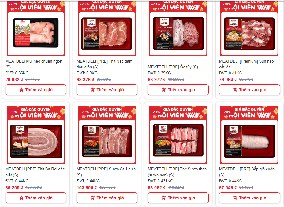 Hiện, các sản phẩm thịt heo có giá bán trong khoảng 92.720 - 155.922 đồng/kg, trong đó các loại đang được giảm giá 20% theo chương trình ưu đãi dành cho hội viên của WinMart.